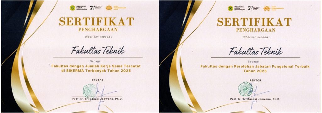 Dalam malam penghargaan tersebut, Fakultas Teknik UNPAR berhasil meraih dua penghargaan sekaligus, yaitu sebagai Fakultas dengan jumlah kerja sama tercatat di SIKERMA terbanyak tahun 2025 dan Fakultas dengan perolehan jabatan fungsional terbaik tahun 2025. Capaian ini mencerminkan komitmen Fakultas Teknik dalam memperkuat jejaring kerja sama serta mendorong peningkatan kualitas sumber daya dosen melalui dukungan berkelanjutan terhadap kenaikan jabatan fungsional.