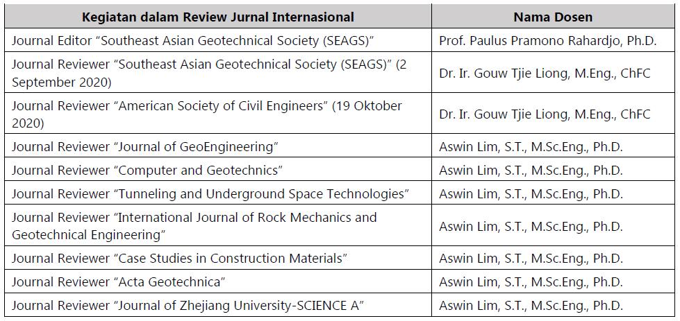- Lestari, A. S., Reinaldo, M., Adrian, L., & Rahardjo, P. P. (2020). Measurement of Static Compaction Energy In Laboratory For Simulating Actial Field Condition on Cohesive Soils. ICCOEE 2020 (UTP), Malaysia. (Konferensi dilaksanakan tahun 2021)