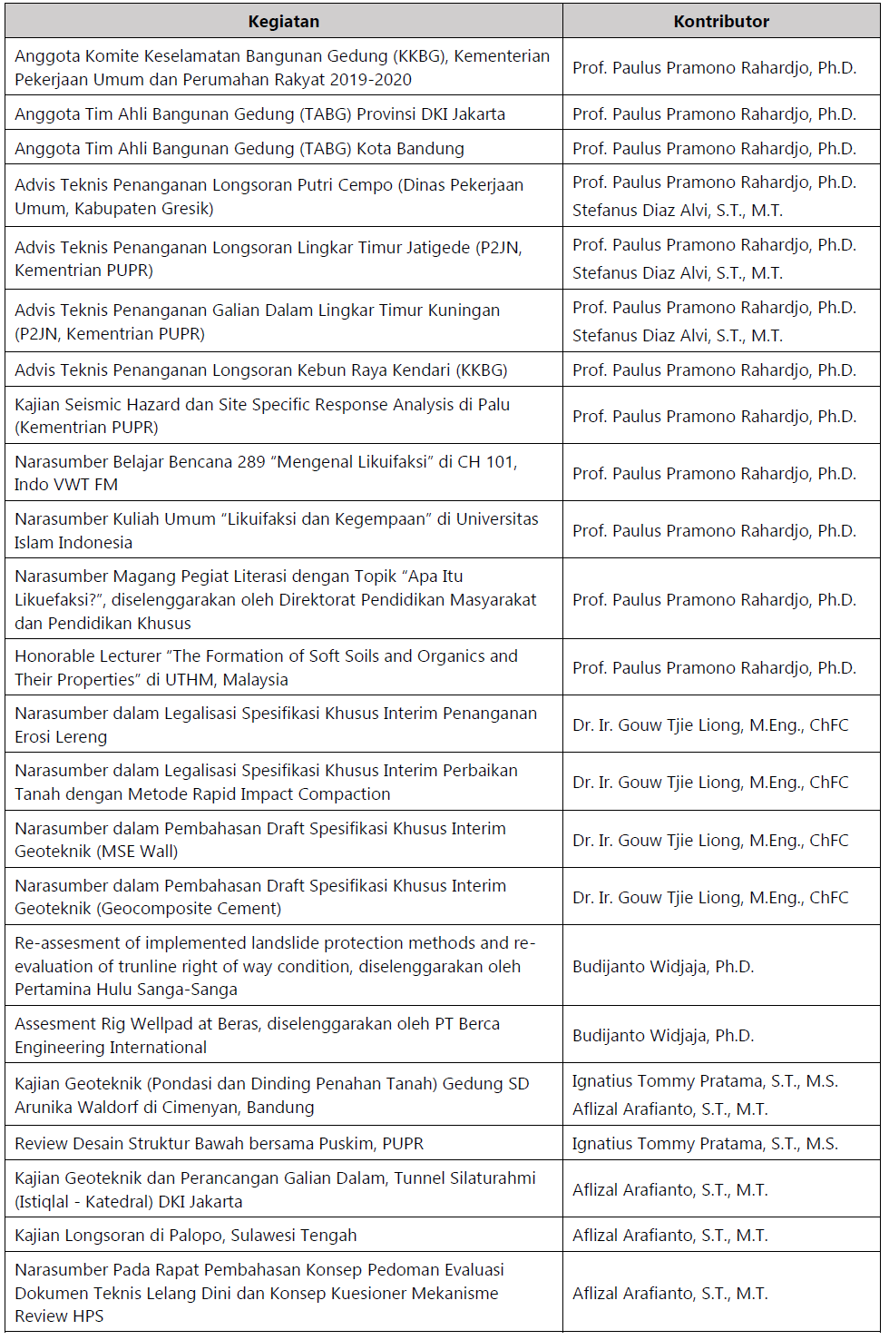 - Rahardjo, P.P. (2020). The Use of Geotechnical Instrumentation and CPTu for Investigation of Geotechnical Failures During Construction in Civil Engineering Projects. Keynote Paper. 6th International Conference on Civil Offshore & Enviromental Engineering (ICCOEE 2020), Malaysia.
